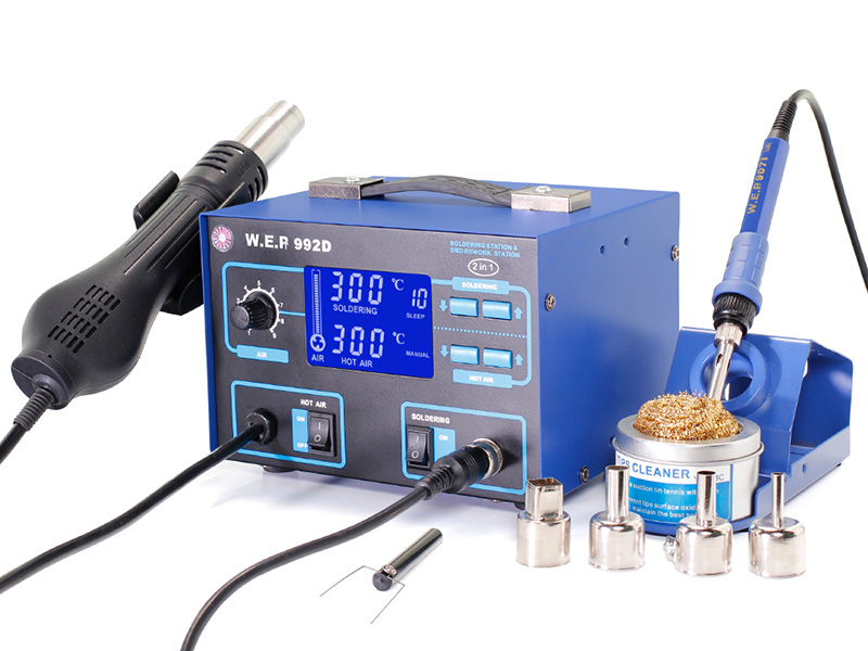 La estación soldadora de retrabajo de aire caliente 992D+ es agregada con interruptor de aire caliente/frío y función de almacenamiento de parámetros de tres segmentos en comparación con la estación soldadora de retrabajo de aire caliente 992D.