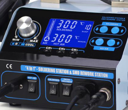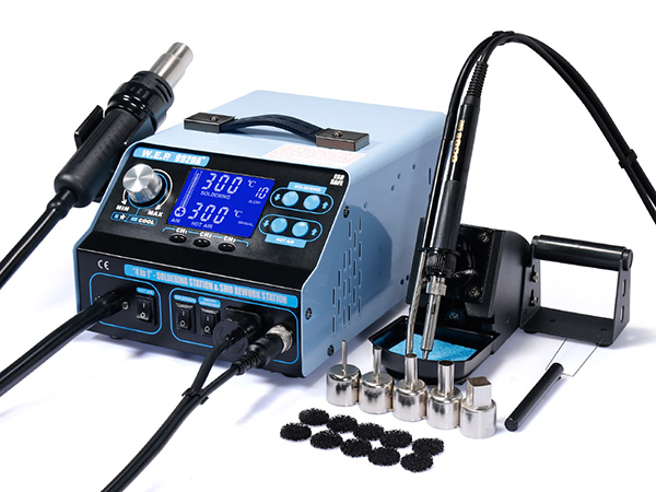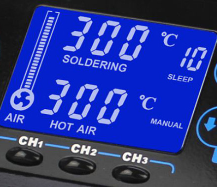 La estación soldadora de retrabajo de aire caliente WEP 992DA+ es una versión actualizada de la estación soldadora de retrabajo de aire caliente 992DA que presenta un diseño de pantalla oblicua personalizada, y añadimos un botón de almacenamiento de tres modos para memorizar todas las funciones de diferentes parámetros. Pulsando un botón de interruptor, puede hallar los parámetros correspondientes rápidamente tal como velocidad de flujo de aire, temperatura de pistola de aire, temperatura de soldador, modo de aire caliente / frío, etc.