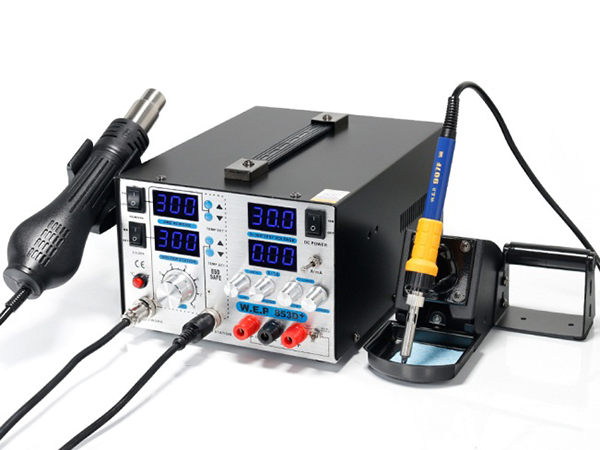 La estación soldadora de aire caliente WEP-853D+ está diseñado para realizar diversos tratamientos, incluyendo encogimiento de calor, secado, extracción de dolor, descongelación, despegue, recalentamiento y soldadura de caucho en distintos componentes electrónicos. Se encuentra integrado por una corriente de 30V/5A DC, pistola de aire caliente y soldador. Panel de control presenta un panel de aluminio y pantalla de corriente DC puede conmutarse entre mA/A.