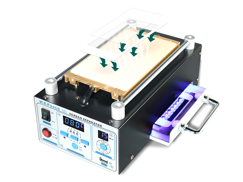 Máquina separadora de pantalla táctil LCD, WEP-946D-III es un equipo especializado diseñado para reparación de teléfono inteligente. El puerto USB de 5V/1A puede cargar los teléfonos inteligentes durante el proceso de reparación. La lámpara UV incorporada permite un secado rápido y mejores resultados de adhesión.
