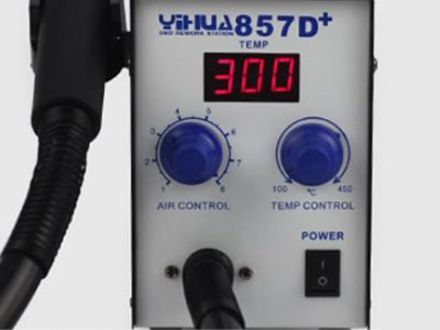 La estación de retrabajo de aire caliente YIHUA 857D+ presenta el último turbo soplador doble con una gran velocidad de flujo de aire y una vida útil larga. El suministro de aire es de turbocompresión, y genera un devanado espiral si utiliza una boquilla grande y un fuerte viento si utiliza una boquilla pequeña. La velocidad de flujo de aire es ajustable.