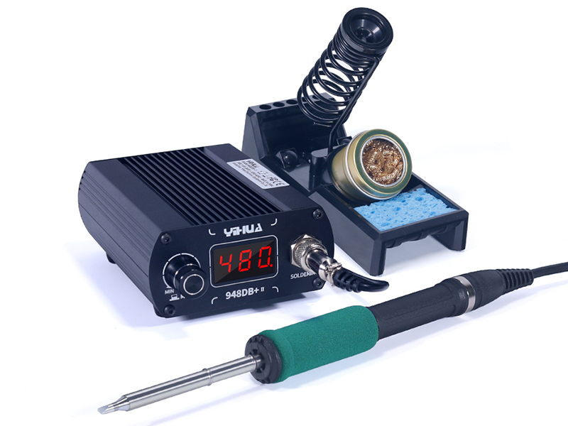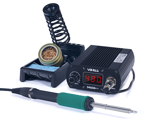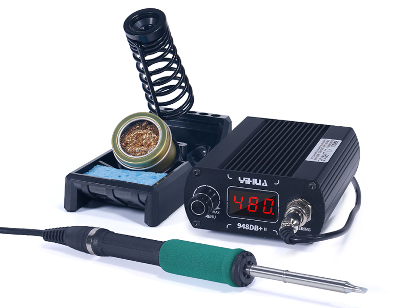 La estación de soldadura de calentamiento rápido 948DB+II T12 con mango de YIHUA se utiliza para la soldadura de componentes electrónicos.